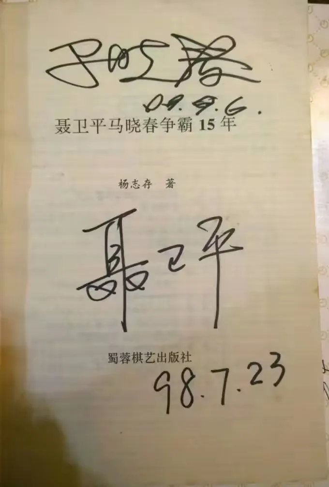 杨志存所著《聂卫平马晓春争霸15年》出版发行后,聂卫平和马晓春在书上签名留字。