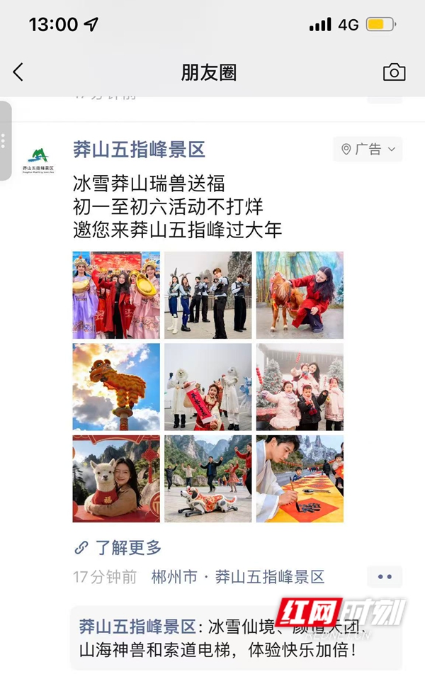 微信朋友圈内,郴州莽山五指峰景区等旅游景区,在线邀约八方游客。正月初一开始,湖南各大景区,将陆续开启丰富多彩的新春主题活动,从非遗展演到沉浸式演艺,从冰雪体验到民俗巡游,让广大游客在湖南度过一个年味浓郁、体验丰富的春节假期。