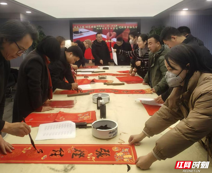 活动现场墨香四溢、暖意融融。湖南省文联主席团委员、湖南省企(事)业文联副主席兼秘书长赵涛高度评价湖南财苑咨询集团的企业文化建设;集团董事长张少球为职工亲手写福、送福,现场年味洋溢。