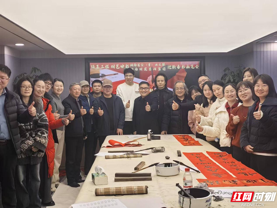 红网时刻新闻2月14日讯(记者 唐雨欣)2月13日,强基工程・“财艺映彩”2026迎新春书画笔会在湖南财苑咨询集团、湖南省企(事)业文联文艺家工作室(张少球)书法工作室举行。旷小津、周少剑、刘立稳、米允翔等书画名家现场挥毫,为企业员工写春联、送福字,传递新春美好祝福。
