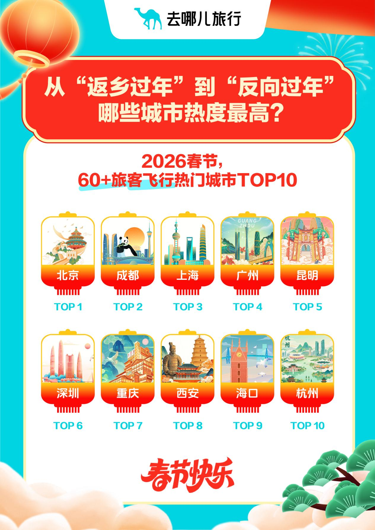 去哪儿数据显示,春节期间反向飞往北上广深一线城市的旅客中,18%为50岁以上人群,其中60岁及以上旅客同比增长超一成。更有不少老人借此机会解锁人生首次飞行体验,60岁以上乘客购买“人生第一张机票”的数量增长两成。