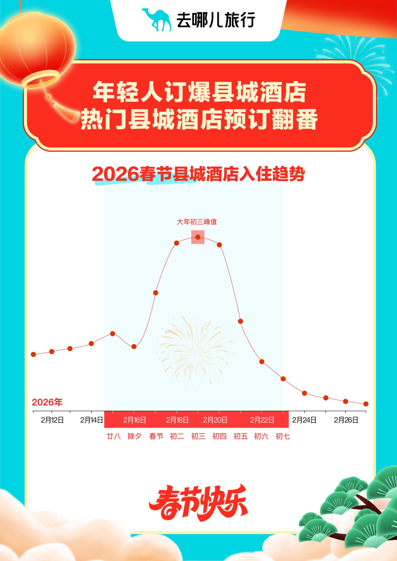 回县城过年的年轻人选择白天在家团圆、晚上住进酒店,以“距离产生美”的方式保持舒适度。去哪儿数据显示,春节期间旅客入住了全国千余个县城酒店,非旅游景区类县城酒店入住增幅超60%。安徽阜阳临泉县、湖南常德汉寿县、广西钦州灵山县等多个传统人口大县酒店入住量翻倍增长。