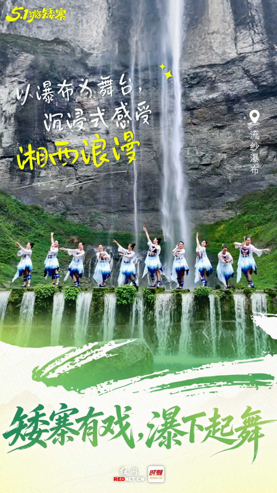 “五一”游矮寨,瀑布下起舞。