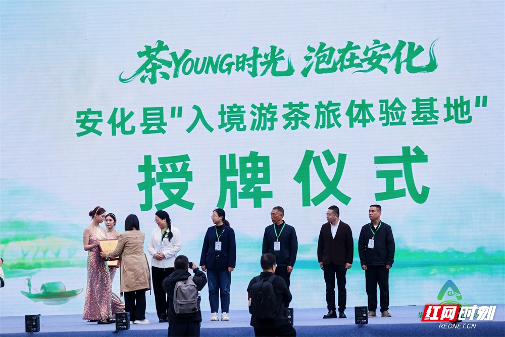 启动仪式充满茶乡特色与创新创意。在“一份来自安化的春日告白”主题快闪活动中,由12位茶仙子、制茶匠人及梅山民俗表演者组成的“安化黑茶天团”惊艳亮相,通过茶园T台秀、茶艺表演与情景演绎,为观众带来沉浸式体验。此外,安化县还被授予“入境游茶旅体验基地”,并进行了茶文旅跨区域联动签约。