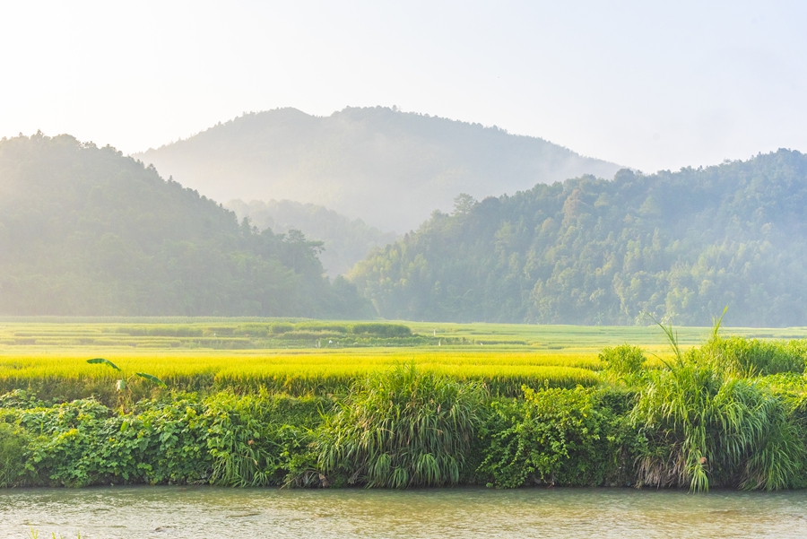 “锄禾日当午,汗滴禾下土……”一群小孩背着书包从田埂走来,红领巾随风飘荡。