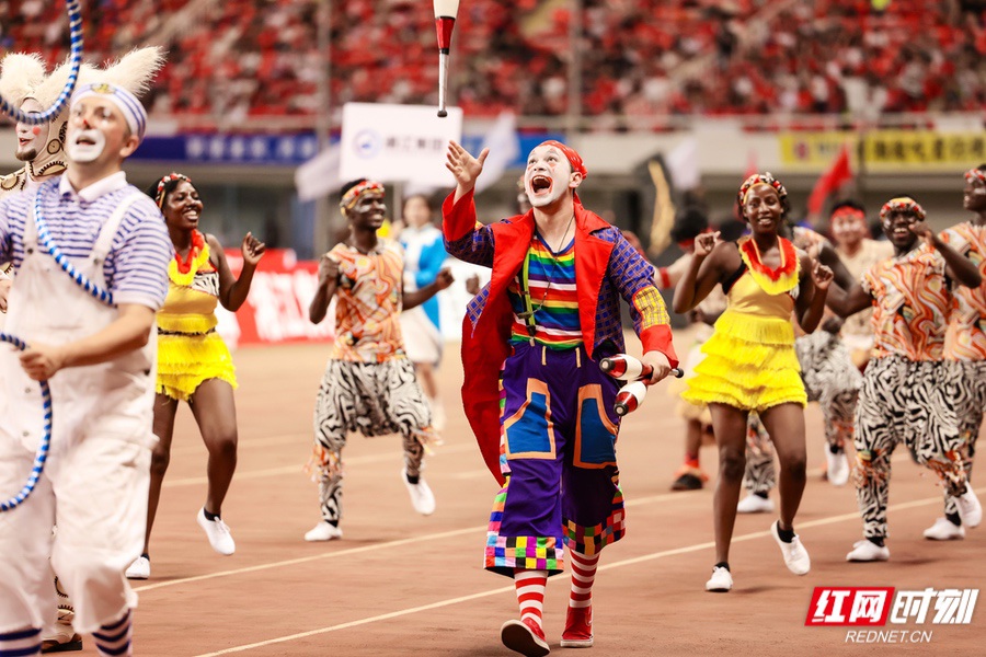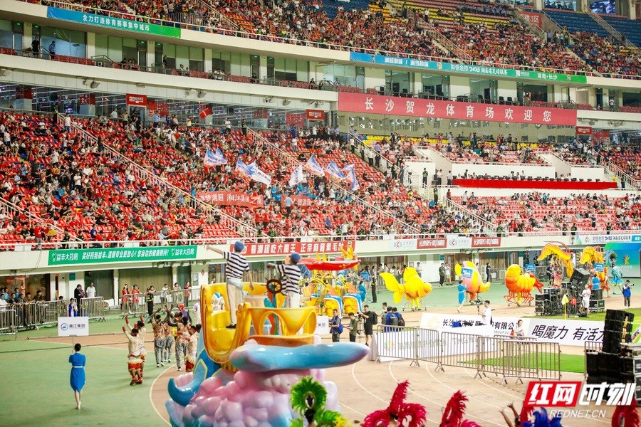 在比赛开场及中场休息期间,由湘江欢乐海洋公园带来的花车巡游与海狮表演轮番登场,营造出体育与奇幻交织的视听盛宴。马术演员驾驭骏马率先入场,瞬间点燃现场气氛。紧随其后的是以欢乐畅享、海洋王国、时空穿越、多彩风情、律动青春为主题的五大花车方阵,演员身着人鱼服饰,与造型生动的海洋生物彩车一同巡游互动,将赛场氛围推向高潮。