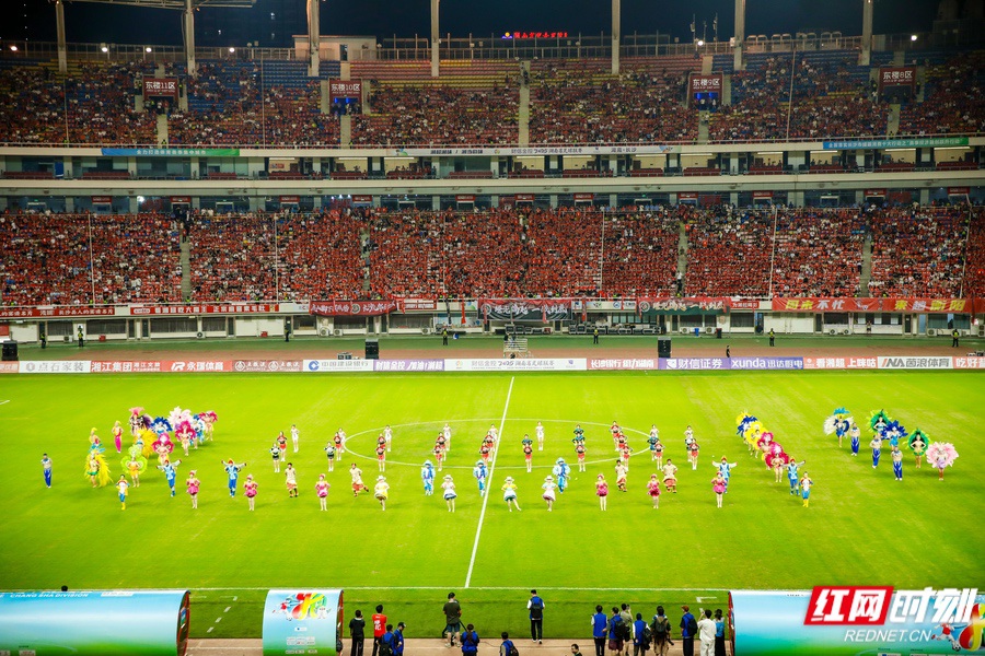 10月10日晚,作为2025湘超联赛长沙队的官方供应商,湘江集团旗下大王山旅游度假区倾情助阵,图为其带来的开场表演。