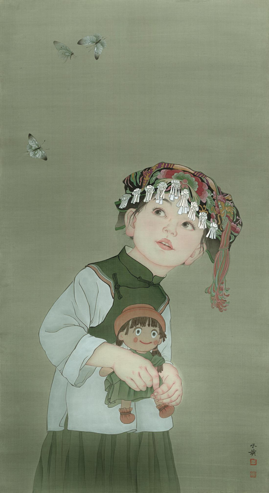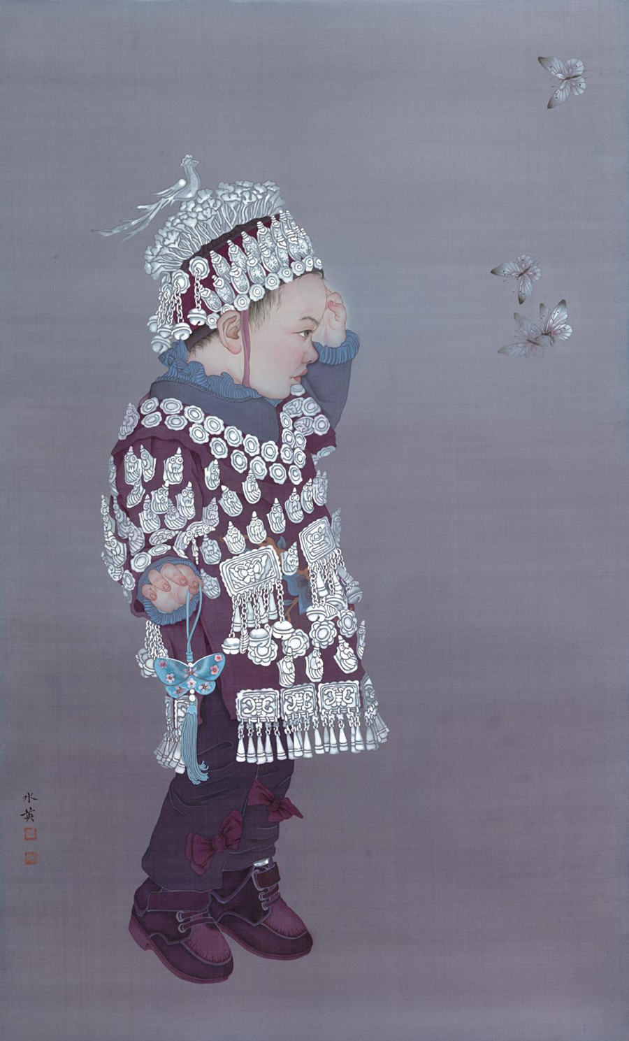 值得一提的是,向水英从事过多年的中小学美术教育工作,她也是两个孩子的母亲,对儿童有着特殊的情感。所以她十分专注于少数民族儿童系列创作。在她内心深处,单纯的孩童世界是一幅五彩斑斓的画。《摇啊摇,摇到外婆桥》《谁家黛帕乖》系列,《蝶儿飞飞》系列,以及《启航》《魔幻世界》《山果果》《五彩的梦》等等,她笔下的孩童系列,莫不形神毕肖,栩栩如生,惹人喜爱,既简单又丰富。通过少数民族儿童的形态塑造,运用细腻的线条,柔美的色调既表现出他们天真幼稚的天性,也反映出他们对未来美好的憧憬。既彰显出作者敏锐的洞察力,也表现出作者扎实的造型表现能力。诠释了作者内心的淡泊宁静以及对生活中美好事物的热爱。