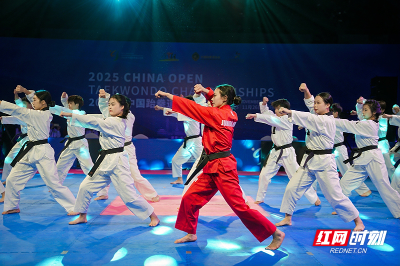 中国跆拳道公开赛开幕式上,一袭红装的潘美静带领湖南省跆拳道示范团的队友们登台表演。供图/潘美静