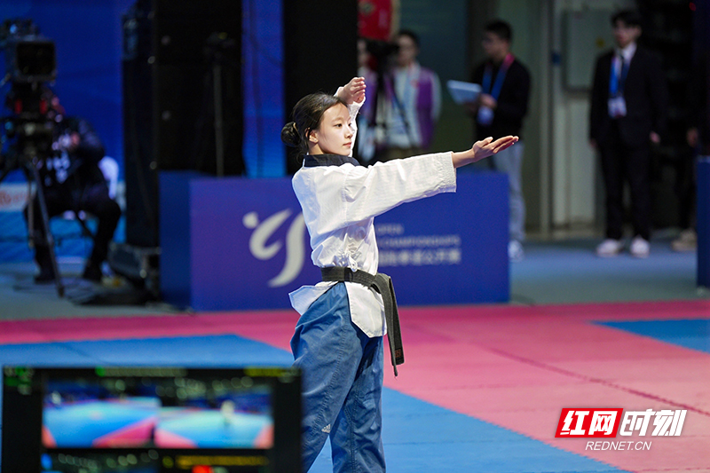 从竞技转向品势,对潘美静而言并非是一种逃避,而是经过深思熟虑后的重塑。她将自己练民族舞所掌握的柔美融入跆拳道的刚劲之中,展现出独属自己的风格。