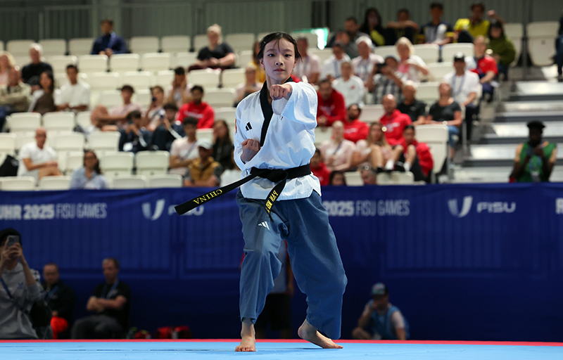 好在,潘美静已在国内各大比赛中证明了自己,她的名字开始被更多人熟知。尽管遗憾错过世锦赛,但属于潘美静的国际大赛首秀并未让她等待太久——2025年,世界大学生夏季运动会在德国莱茵·鲁尔举办,跆拳道项目设有品势比赛,既符合参赛年龄要求又具备较强竞争力的潘美静,很快入选大运会中国代表团的名单,成为参加该项目的4名中国选手当中唯一的湖南人。