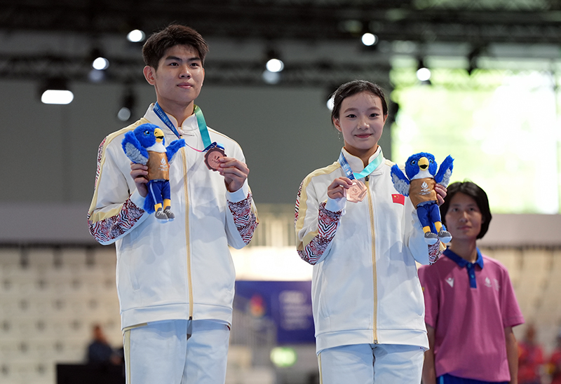 2025年7月17日,潘美静(右)携手吴伟康(左)摘得大运会跆拳道混合双人品势铜牌。图/新华网
