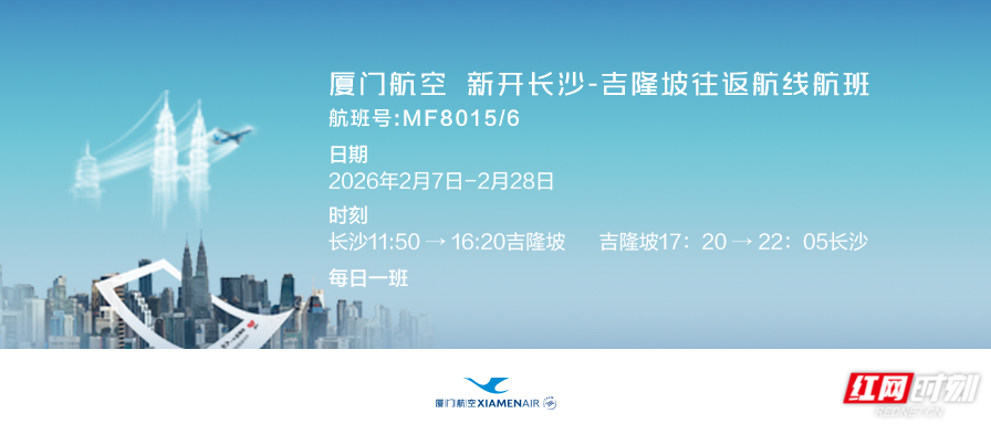 红网时刻新闻12月20日讯(记者 何超 通讯员 赵晶 罗孟哲)为服务湖南开放大局,厦门航空湖南分公司宣布,将于2026年2月陆续开通长沙至泰国曼谷、马来西亚吉隆坡两条国际往返航线。此举将进一步完善湖南与东盟国家间的空中通道,为双边经贸、文旅交流提供更高效的交通选择。