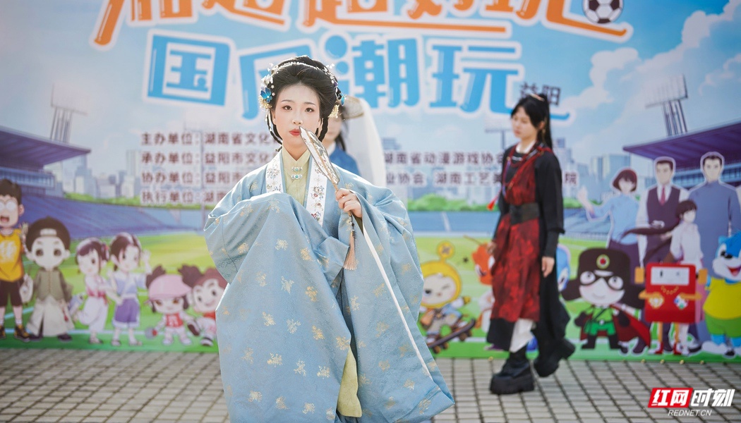 湖南省“湘超 超好玩”国风潮玩系列活动在益阳奥林匹克公园举行。图为汉服走秀。