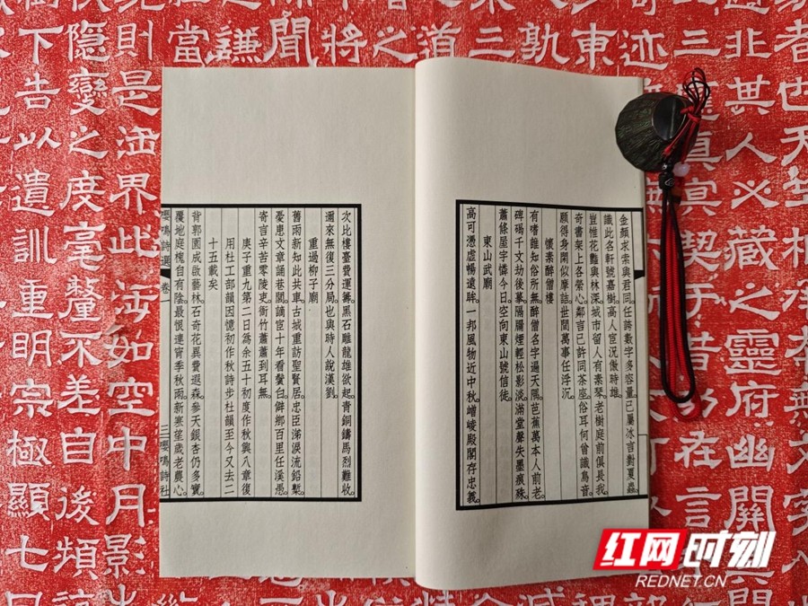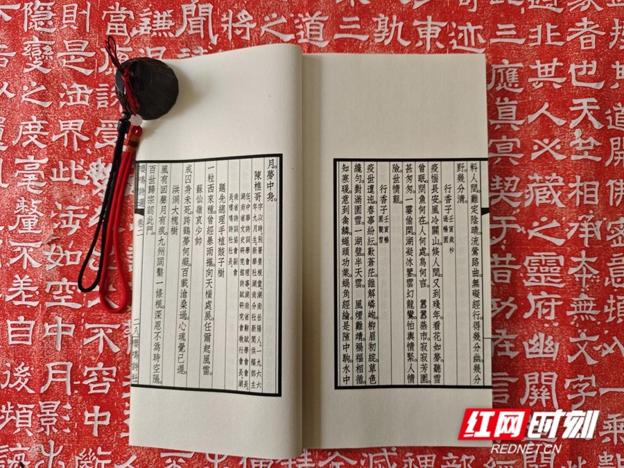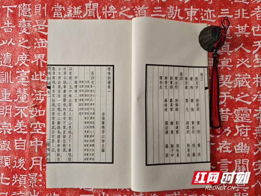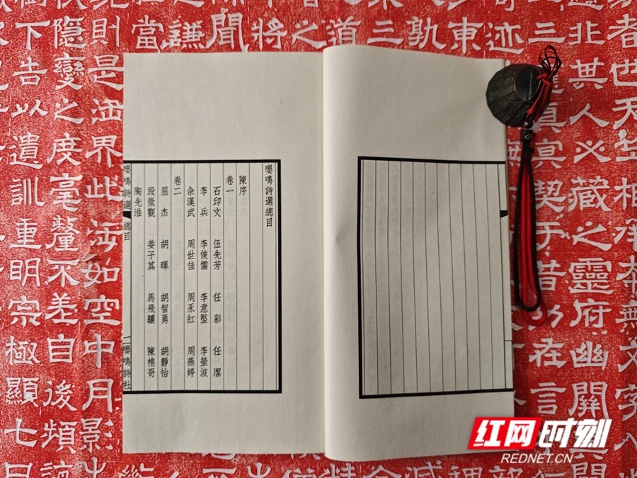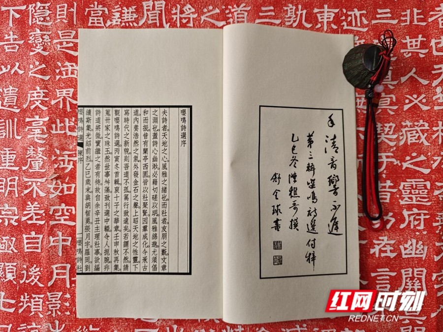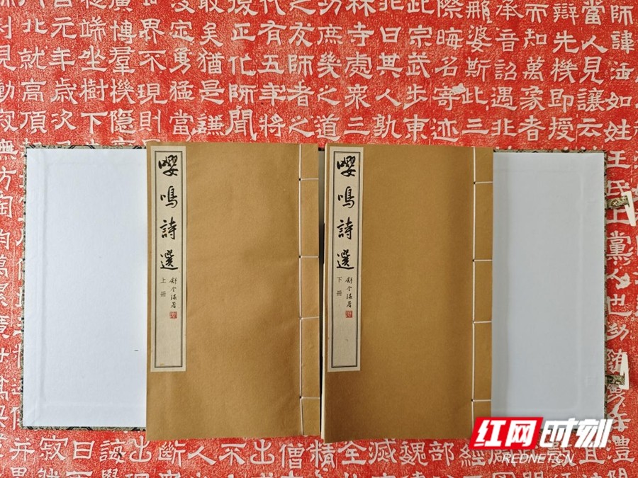 此次发行的《嘤鸣诗选》第三辑线装本,一函两册,仿古宣包角,宋锦函套,非常精美。内册扉页书名则由湖南省文史研究馆馆员熊东遨、湖南省书法家协会副主席石印文题写。它延续了传统线装书的雅致格调,将古典装帧美学与当代诗词创作相结合,既彰显了中华优秀传统文化的厚重底蕴,也让新时代的诗词风采得以生动呈现。